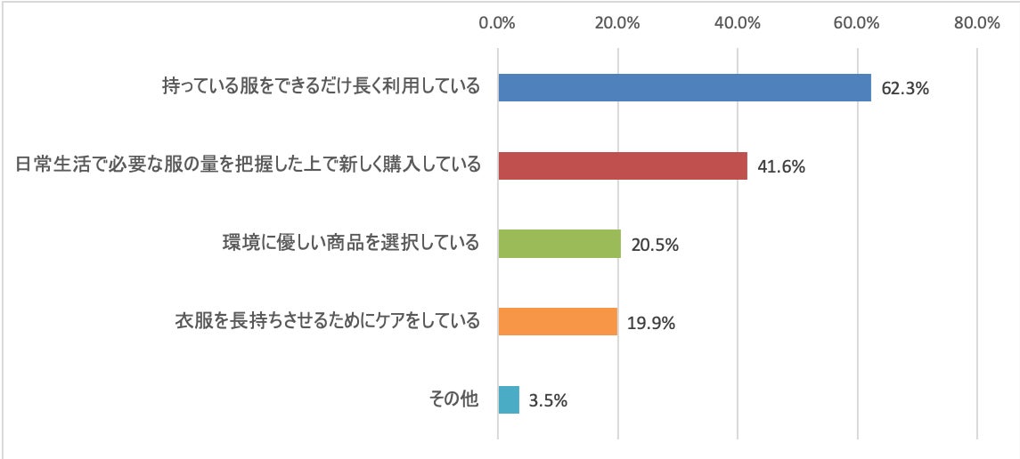 サスティナブルな取り組みに対して、62.3%と半数以上のユーザーが「持っている服をできるだけ長く利用している」と回答。
