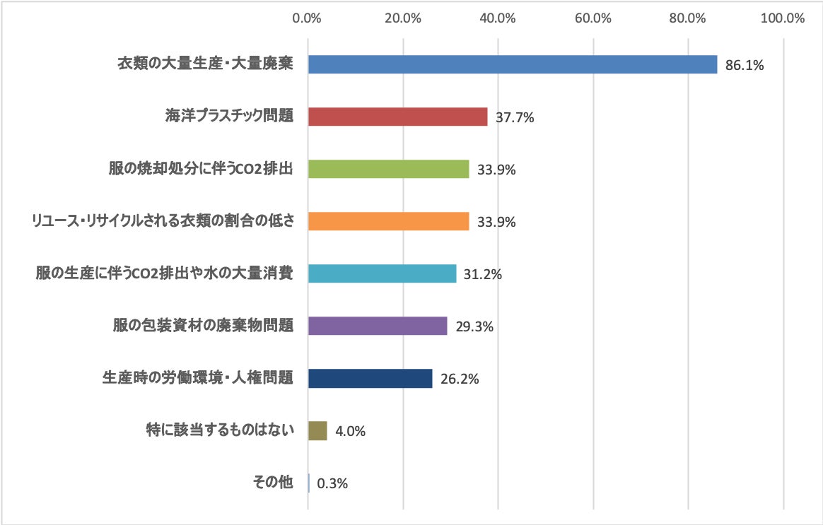 86.1%の人が衣類の大量生産・大量廃棄についての社会問題を知っていると回答。また、服の焼却処分に伴うCO2排出等、その他の課題点に関しても約3割の方が認知している結果に。