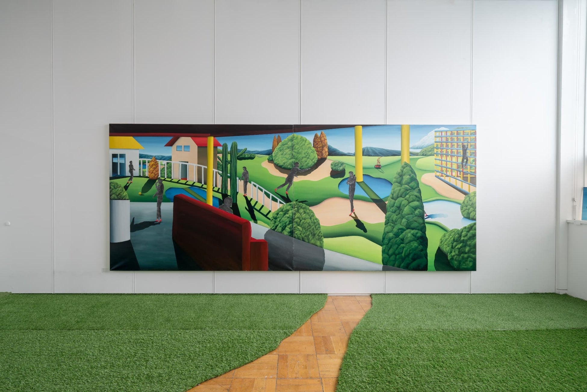 城田は、感情や記憶といった内面の世界をテーマとして制作を行っています。日常の中で起こる感情の動揺や傷つき、トラウマの経験に基づいて描かれる色鮮やかな心象風景は、明るくもどこか不穏で、その中に点在する人物像は、実体を持たない魂や概念のような存在として木炭で表現されています。否定的な感情を含む体験の描出は、作家にとっては昇華の行為であり、また、描くことと並んで昇華することそのものが、城田の制作の主軸となっています。