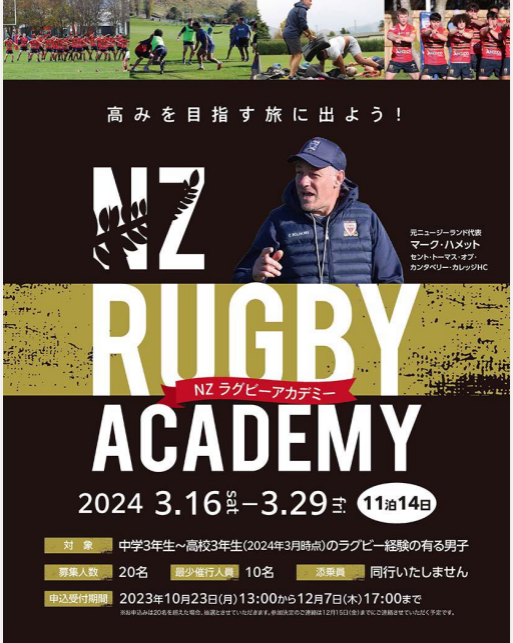 株式会社 博報堂DYスポーツマーケティングは、次世代のラグビー選手育成を目的とした「ニュージーランド ラグビーアカデミー」を株式会社JTB、セント・トーマス・オブ・カンタベリー・カレッジ高校(ニュージーランド クライストチャーチ)の協力のもと企画し、10月23日(月)より株式会社JTB横須賀支店にて販売開始されました。