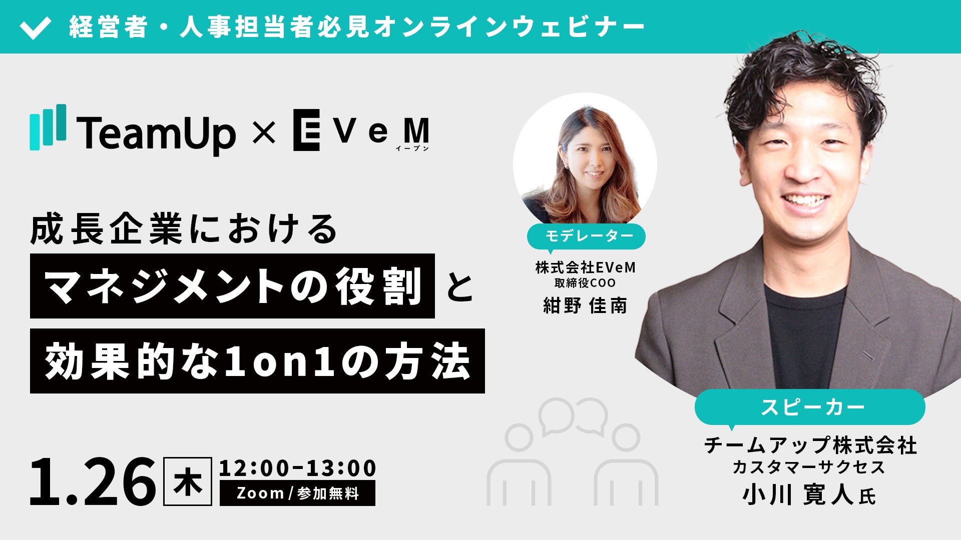 本イベントは、株式会社EVeMの主催で、社内での「チームビルディング」「マネージャー育成」「経営チーム作り」にスポットを当てて、より強いチームを作っていくための秘訣を、クラウド1on1ツール「TeamUp」を提供するチームアップ株式会社と深掘りしていく企画となります。