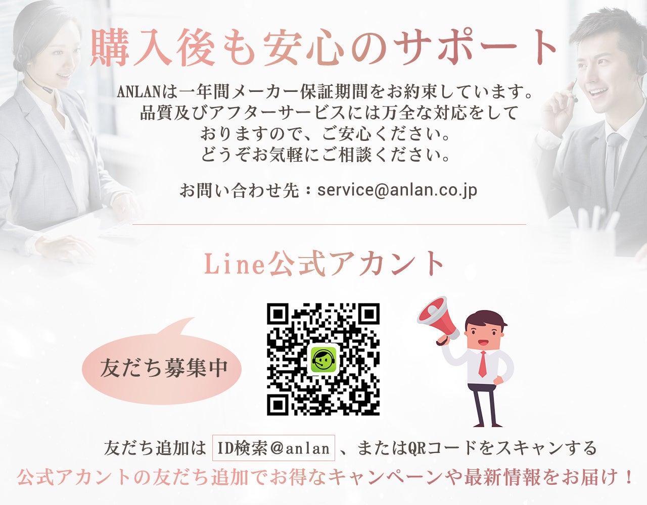 ANLANは一年間メーカー保証期間をお約束しています。弊社はお客様にご満足いただける品質•サービスのご提供に努めております。またお買い上げ後、故障と製品についてご不明な点や修理に関するご相談があれば、メールやLINE、電話でご連絡頂ければ、お買い上げの販売店から返品・交換を対応させて頂きます。ご安心ください。どうぞお気軽にご相談ください。