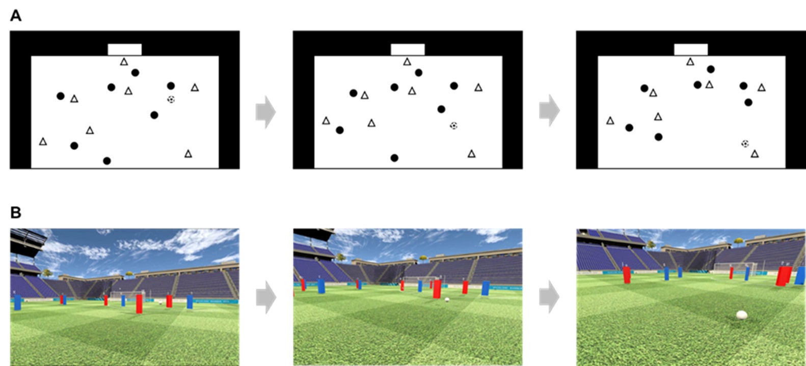 3人称視点の2D映像(A)と1人称視点の3D VRシーン(B)で提示された7対7のサッカーの状況