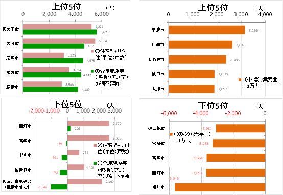 中核市について、供給量に住宅型とサ付住を加えると、旭川市、函館市、高崎市では不足が解消状態にあります(図6)。これらの自治体では、包括ケア型の高齢者住宅・施設は充足しているものの、既存の住宅型やサ付住の入居者の重度化が今後の課題と思われます。