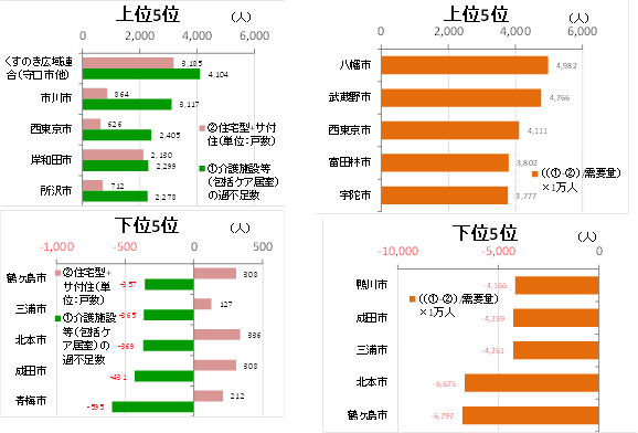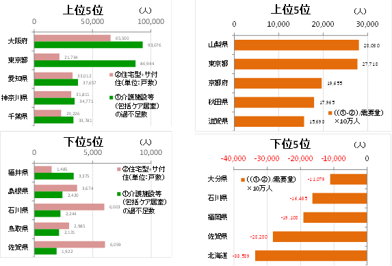 本データ集では、要介護者向け高齢者住宅・施設(包括ケア居室)の過不足状況を、需給と供給の差分に置き直して将来予測をしました。