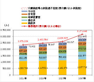 第8期計画や過去の実績値とその伸び率から予測すると、全国では需要量を要介護2以上とした場合、包括ケア型の高齢者住宅・施設は2035年に242万人分不足、要介護3以上とした場合は88万人分不足と予測されます(図2、図3)。