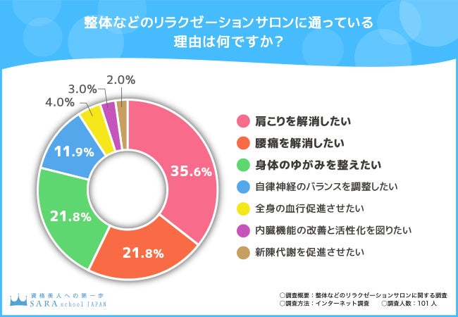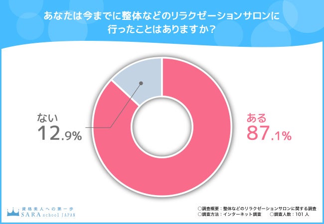 そこで今回、通信教育講座『SARAスクールジャパン』(https://www.saraschool.net/)を運営する株式会社新生技術開発研究所は、全国の男女101名を対象に「整体などのリラクゼーションサロン」に関する調査を実施しました。