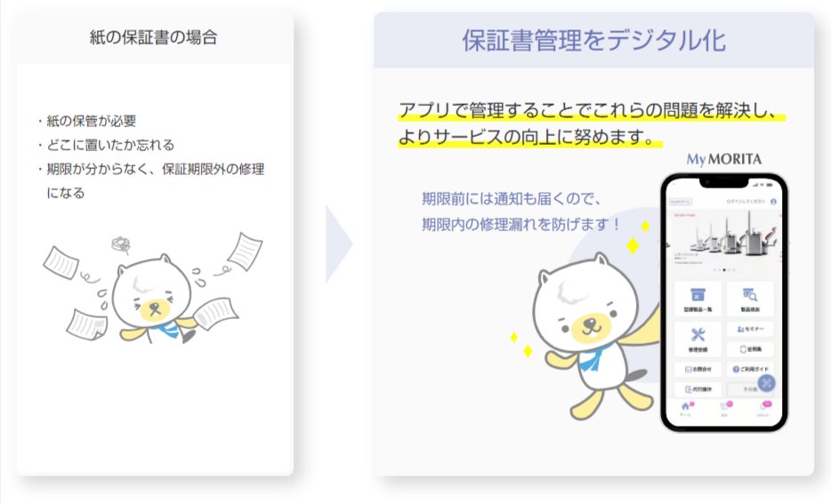 株式会社モリタ(大阪府吹田市、代表取締役社長:森田晴夫、以下「モリタ」)は、2024年4月22日、ユーザーサポートアプリ「My MORITA」をリリースしました。ご購入いただいた製品の紙の保証書をデジタル化し、より充実したサービスの提供を目指します。