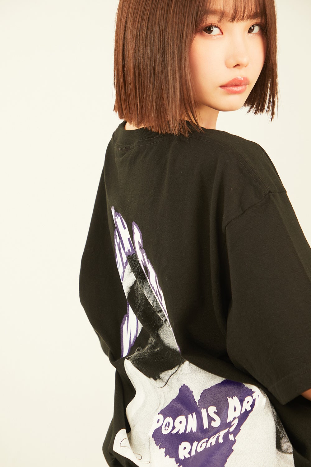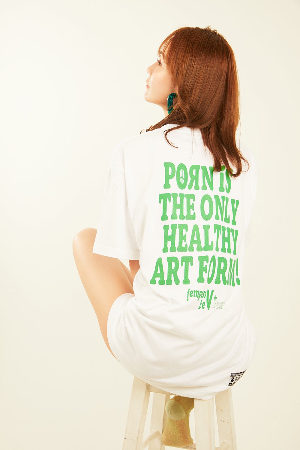 フロントには、PORN is ARTをシティ感のあるロゴに落とし込み、バックプリントに、"What the fxxk!"かわいらしさとインパクトを持ってきたデザイン。