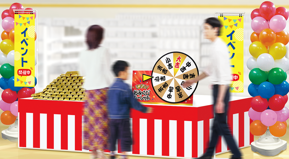 くじ・ビンゴカードなどの抽選用品から、販売員の着用する法被など、お客様を引きつけるイベント用の集客アイテム。