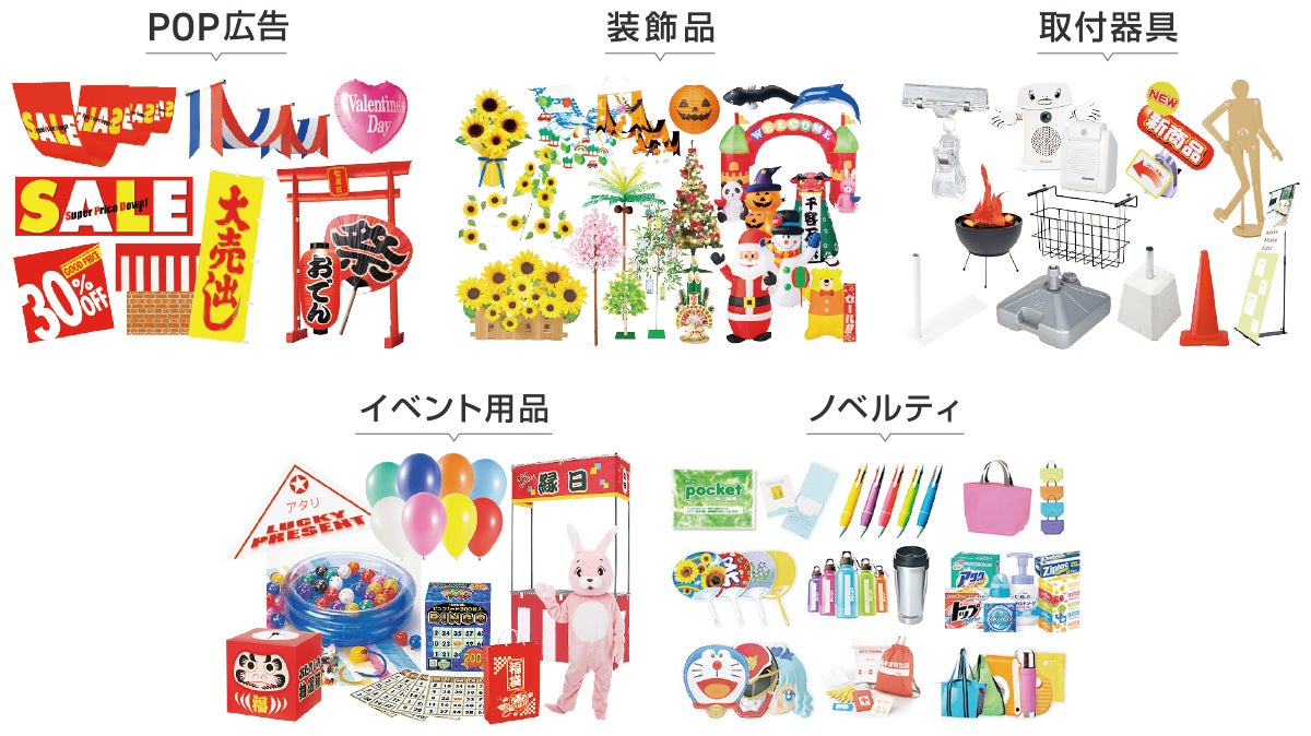外国語対応のPOPや、日本独自の美しさを表現した装飾アイテム・イベント用品など、インバウンド向けに特化した商品で、効果的なプロモーションをサポートします。