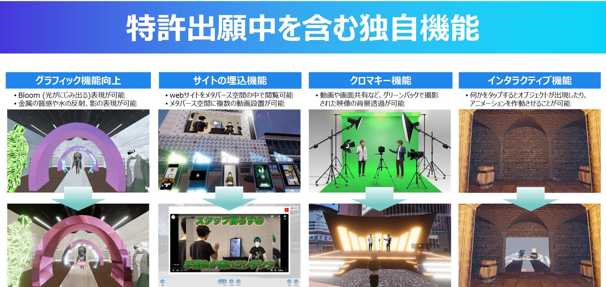 当社のバーチャルプラットフォームは、同一Hubsベースでの移行メリットに加え、特許出願中の機能も含め機能・グラフィック面が向上する独自機能(オプションを含む)を多数備えています。