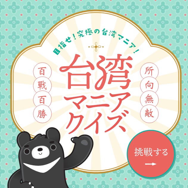 「台湾マニアクイズ」では、台湾にまつわる初級・中級・上級のクイズをご用意。それぞれ5問全てに回答することで、あなたの台湾マニア度がわかります!