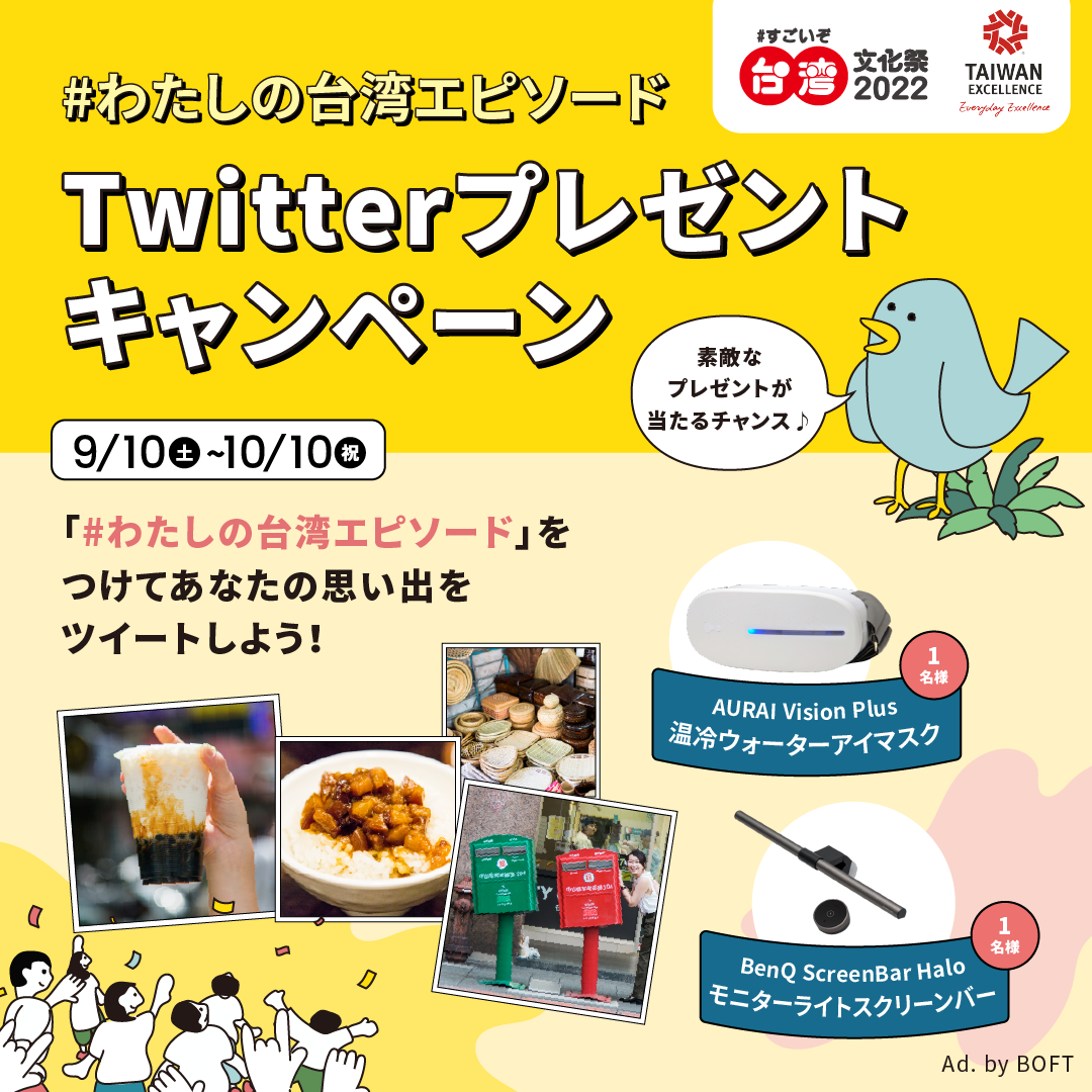 その他、台湾の「すごい!」が伝わる写真を募集する「#すごいぞ台湾 フォトコンテスト」や台湾の思い出を募集する「#わたしの台湾エピソード Twitterプレゼントキャンペーン」など、SNSから参加ができるキャンペーンも実施。抽選で「台湾エクセレンス」受賞製品が当たるプレゼントキャンペーンも行います。