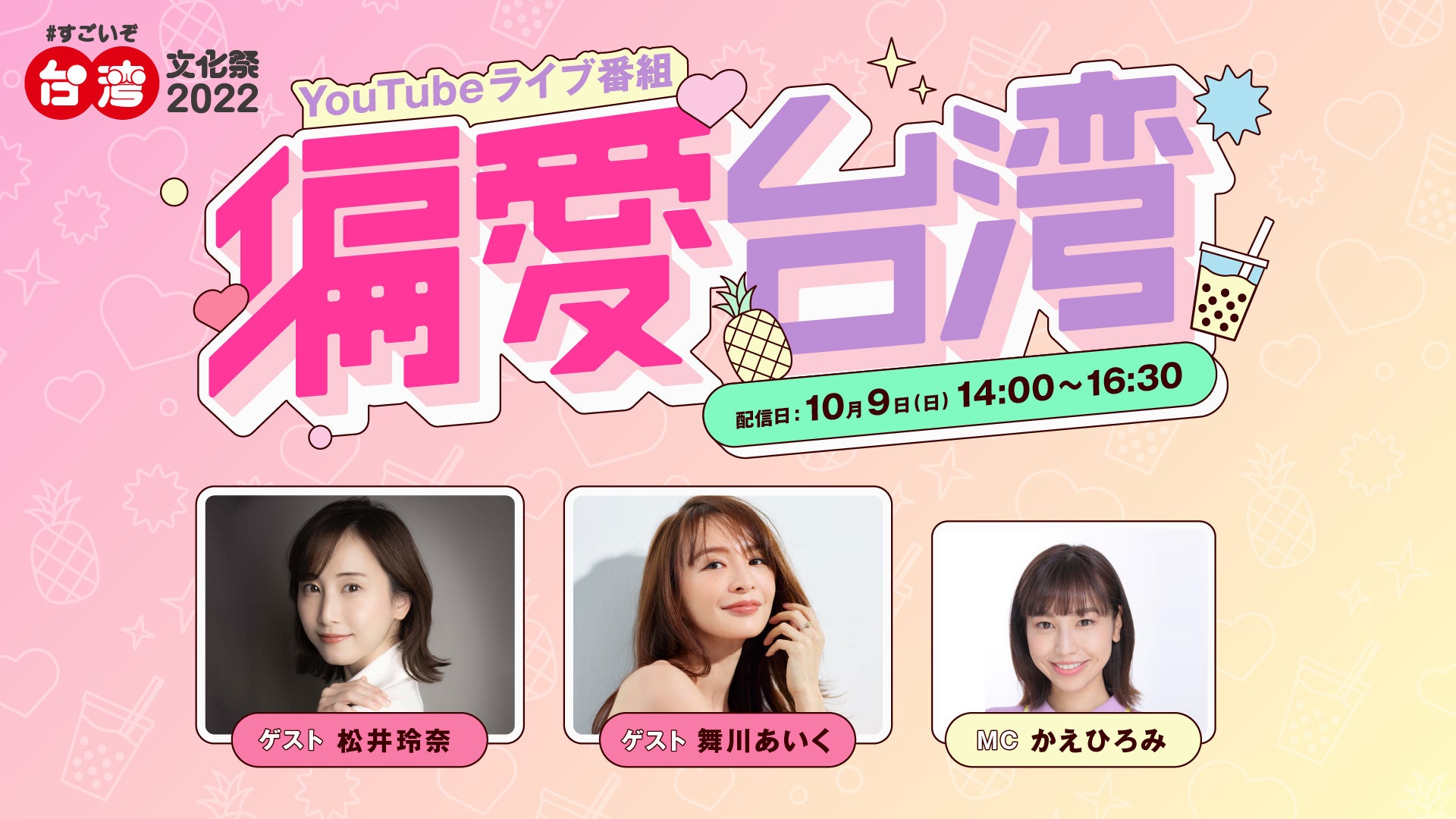 芸能人ゲストトーク番組「偏愛台湾」(10月9日(日)14時〜YouTubeライブ配信)では、役者・作家など幅広い分野で活躍する松井玲奈さん、多数のファッション誌で活躍しフォトグラファーとしても活動する舞川あいくさんをお迎えし、番組MC・かえひろみさんの進行のもと、偏愛する台湾カルチャーについてじっくりと語っていただきます。