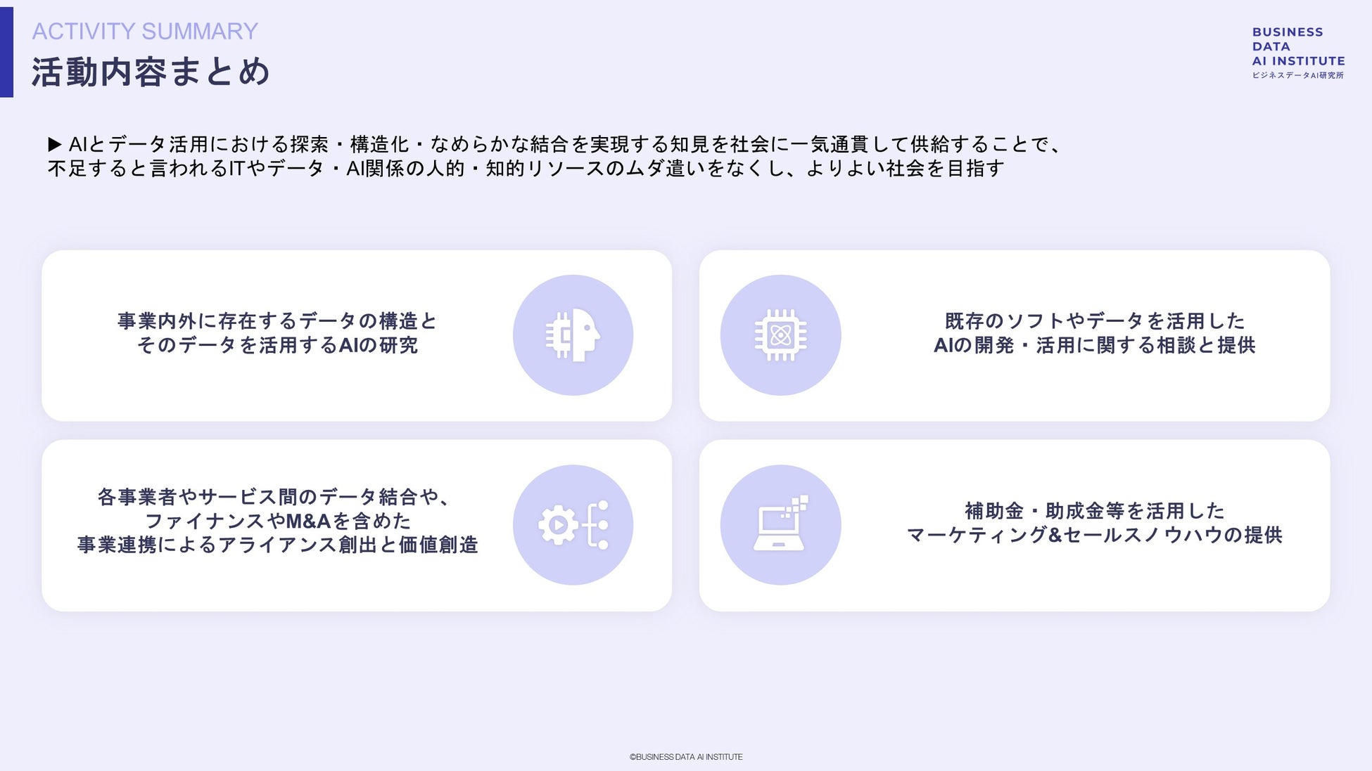 日本社会の進化・移行に寄与するべく、SaaS・ASP・パッケージソフトウェア等の企業に協力いただきながらデータに関する研究等を行い、”+AI”を共に考え、その研究結果をビジネスデータとAIの利用者たる企業に提供することを目的とし、当社団を設立・運営してまいりたいと考えております。