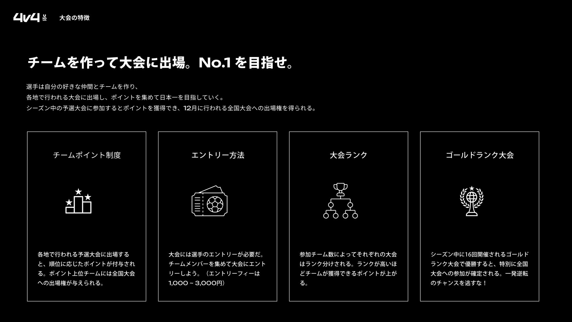 「4v4」とは日本のサッカー界をさらに盛り上げるべく、プロサッカー選手・本田圭佑がルールを考案した、4対4で行う新しいサッカー全国大会です。本大会は「サッカーの世界大会を全ての子どもに」というミッションのもと、育成年代の10歳以下の子どもを対象にした競技です。