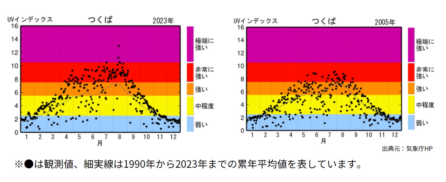 さらに、下のグラフからもわかるように2005年と比較しても2023年は紫外線量自体が多くなっています。