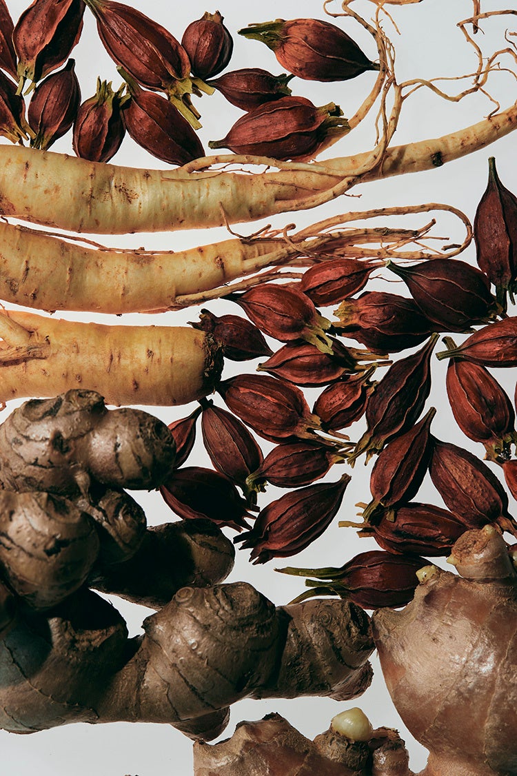 高麗人参の根、ジンセンと、健康をサポートするスパイスのショウガ。
