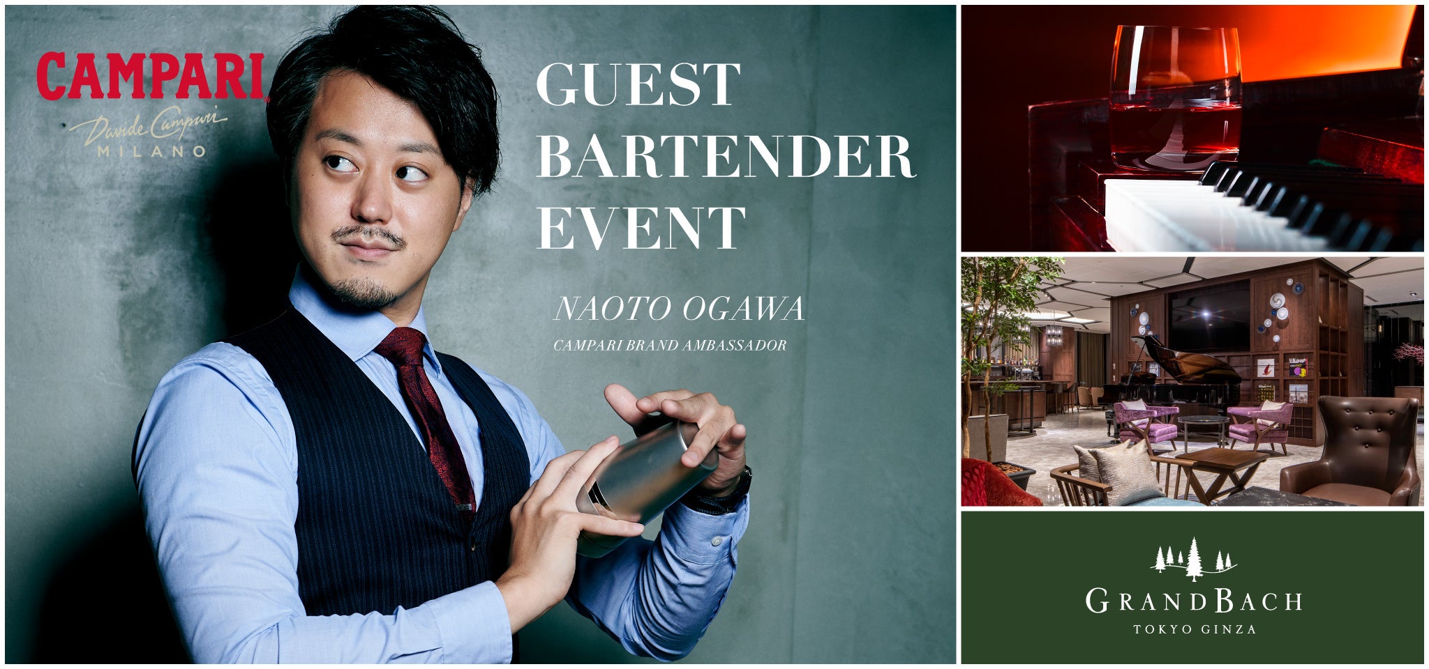 イタリアを代表するリキュールブランド「カンパリ」のブランドアンバサダーである小川 尚人氏が監修したカクテルとともに、グランバッハ銀座のヘッドバーテンダー高橋 司が考案したカクテルはこの日だけのオリジナルカクテルとなります。また、当日は小川 尚人氏と高橋 司がカクテルをご提供いたしますので、ぜひこの機会をお見逃しなく。この日限りのオリジナルカクテル3杯は料金に含まれていますが、4杯目以降は2,000円でお召し上がりいただけます。