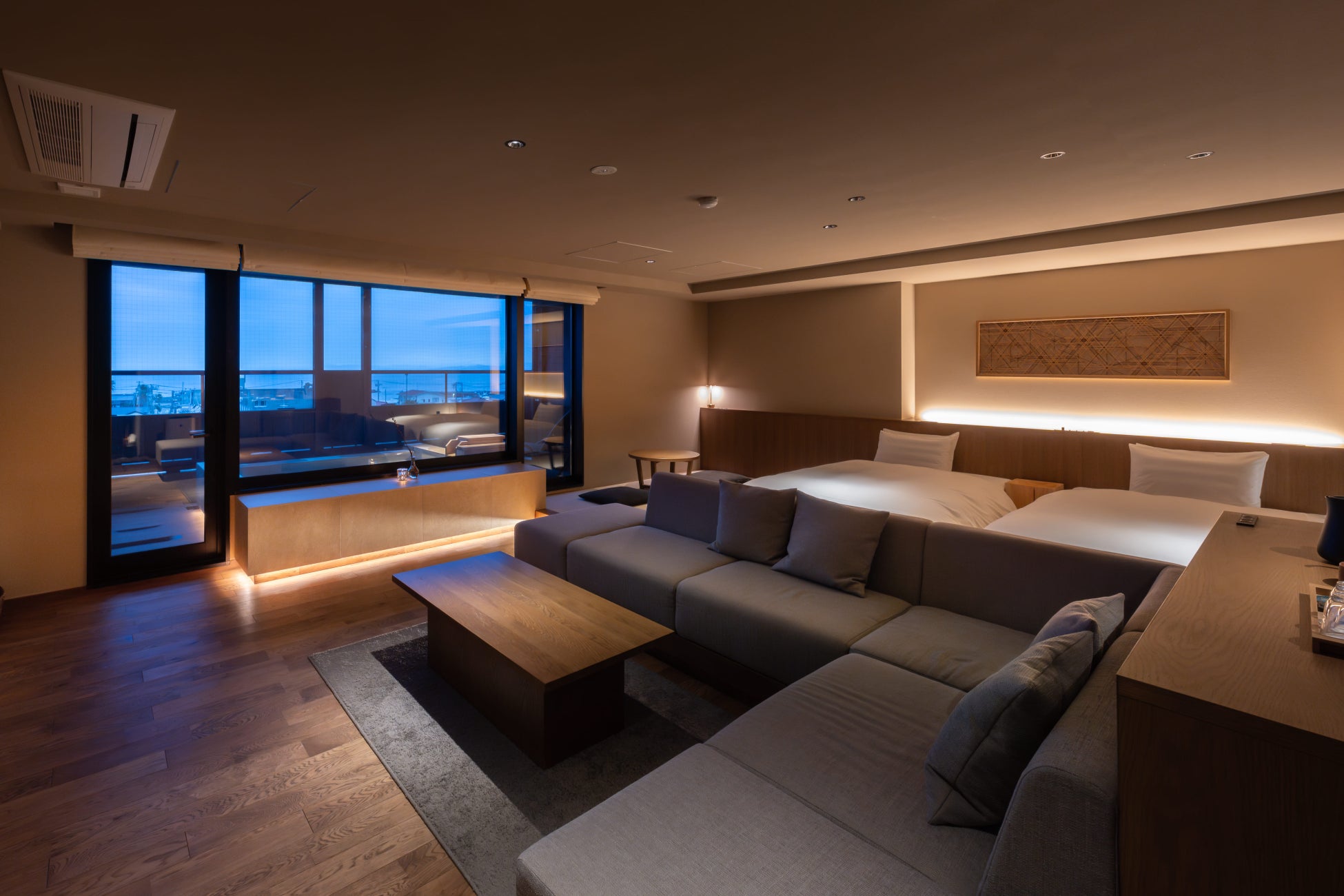 セミダブルベッドが2台の角部屋ツインルーム。ベッドを繋げてハリウッドツインにすることも可能です。西伊豆の美しい夕日が見られる客室露天風呂も付いております。