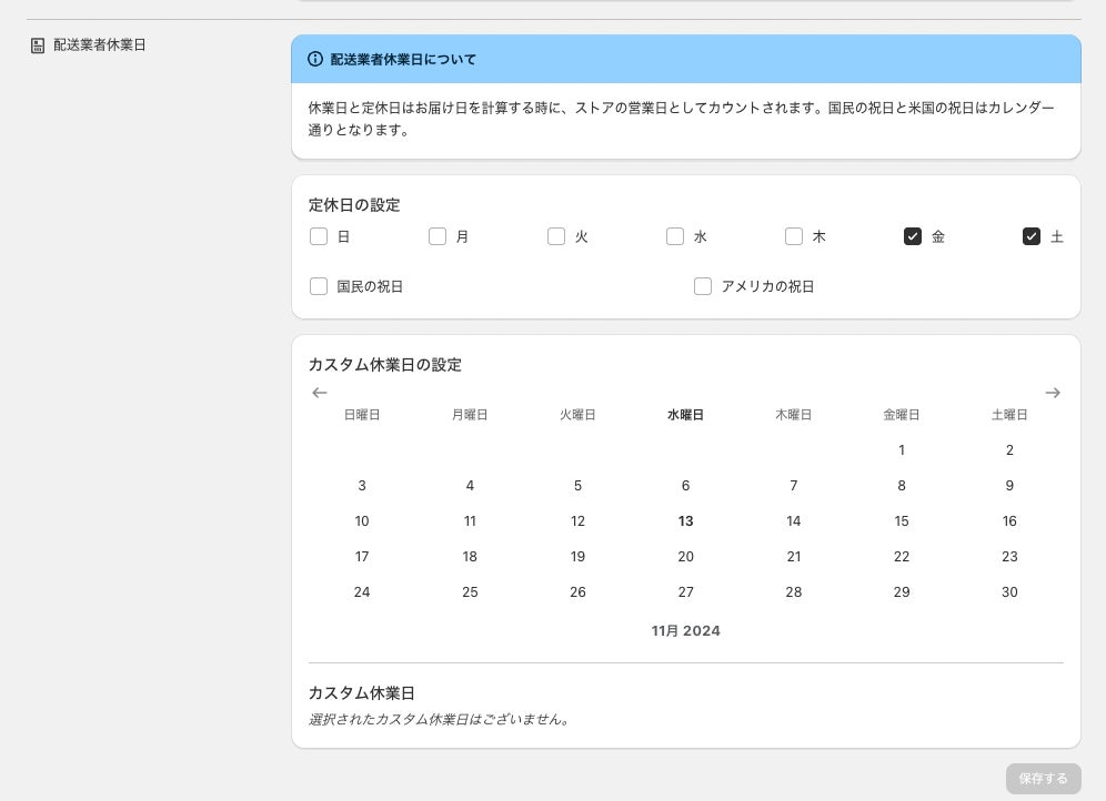 お届け日時設定で、配送業者休業日を設定できるようになりました。