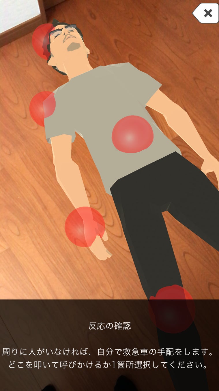 AR技術を使用しているため非対面で訓練をすることができます。任意の場所に心停止傷病者のアバターを出現させ一次救命処置における胸骨圧迫やAED操作まで一連の動作を学習する事ができます。問題形式となっているため訓練や教育アプリとしてご使用していただくことも可能です。「死戦期呼吸」という心停止直後にみられる異常な呼吸運動についても3DCGで再現しており、一般的な心肺蘇生訓練用マネキンでは不可能な部分を学習することができます。