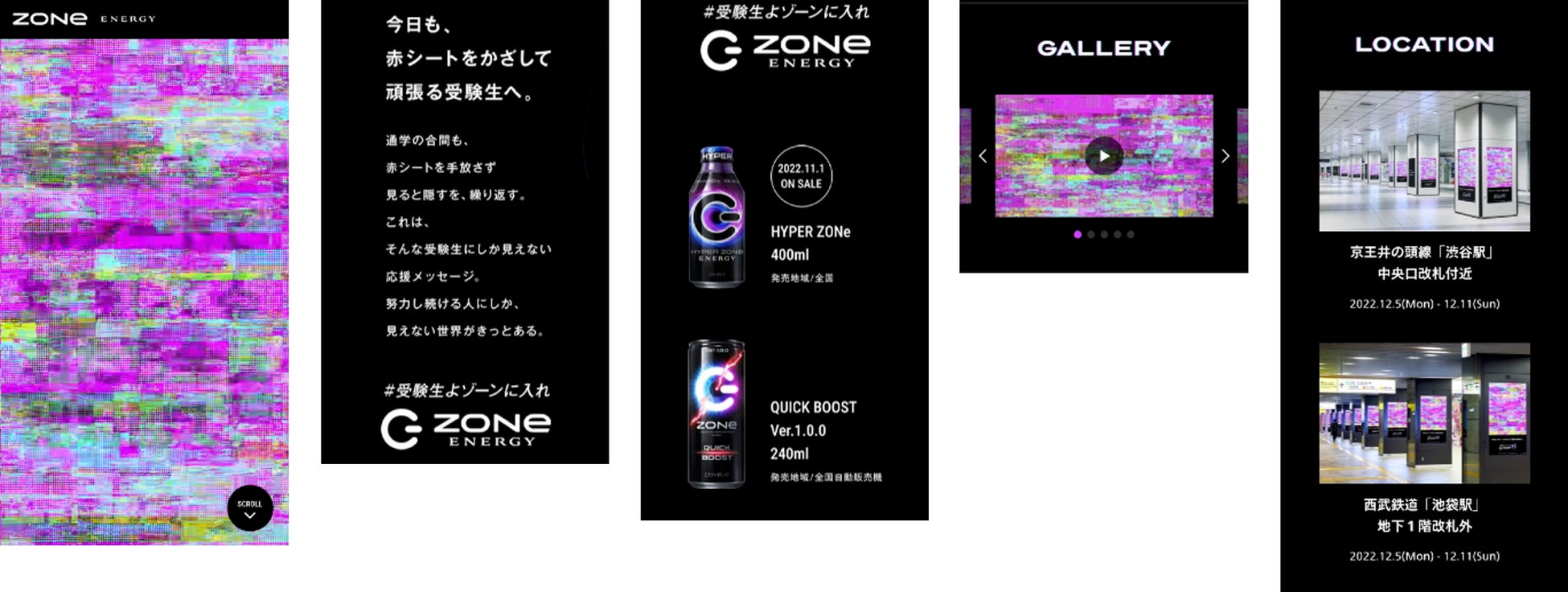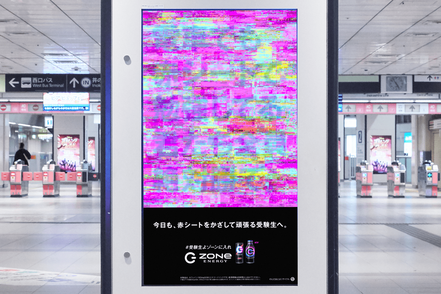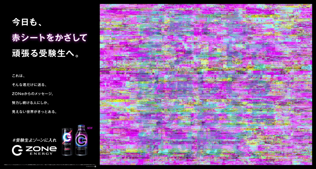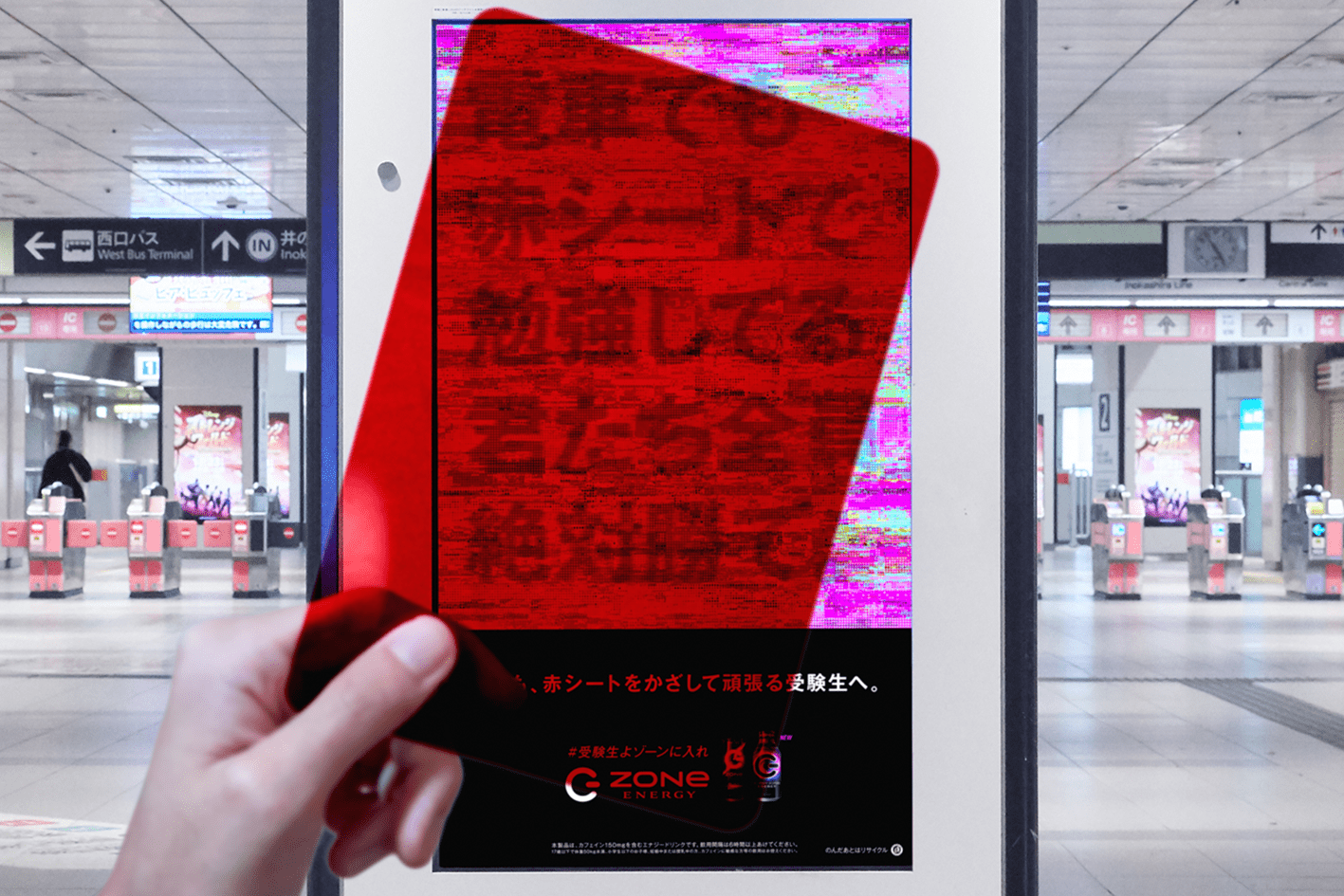 飲む者を無敵のゾーンへと導く「ZONe ENERGY(ゾーン エナジー)」は、受験生の必需品である赤シートを活用した”受験生にしか見えないメッセージ”を2022年12月5日(月)より予備校が密集する渋谷駅・池袋駅にて掲出開始します。本広告では受験を乗り越えてきたOB/OGである河野玄斗さん・ヨビノリたくみさん・ぴけさんに応援メッセージを頂いています。