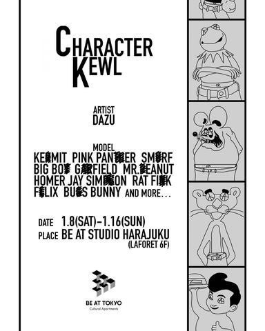 どこかユーモアのある作風を好み、イラストを描くDAZUが1月8日(土)よりBE AT STUDIO HARAJUKUにて展示を開催いたします。グラフィックデザイナーとしてクライアントワークではロゴデザインを手掛ける一方、今回の展示「CHARACTER KEWL」では、某キャラクターの中から約20体をモデルに見立て、ブランドラックのような、ポートレート写真ならぬ、”ポートレートイラストっぽさ”をテーマにゆるいタッチで描き上げました。また、"モノの気持ち"をテーマにデザインを落とし込んだというバンダナやソックスといったDAZUのオリジナルグッズやTシャツ、エコバッグもご用意しております。