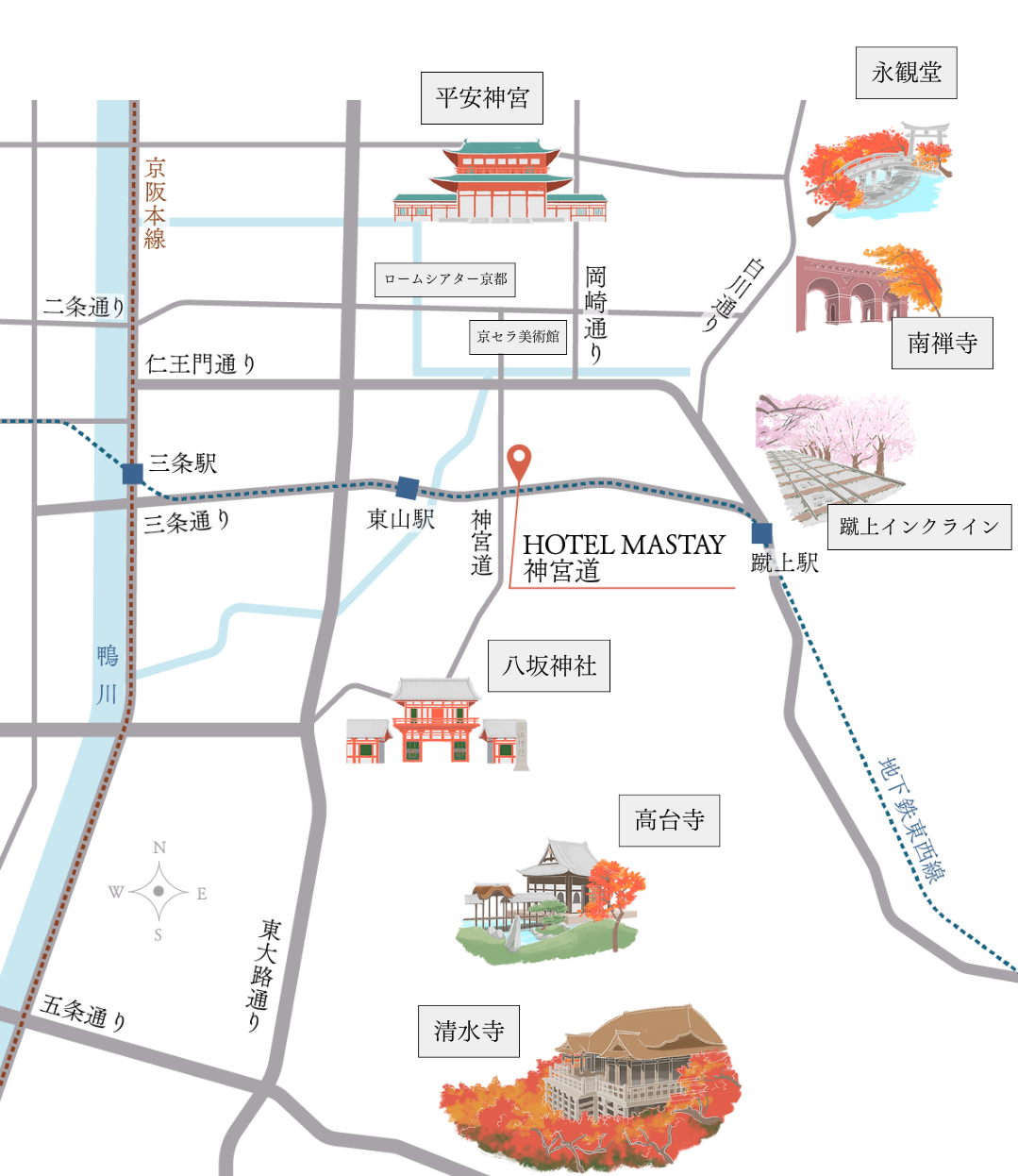 当館の位置する東山・岡崎は寺社巡り・グルメ・アートなど、京都の魅力をたっぷり堪能できるエリアです。