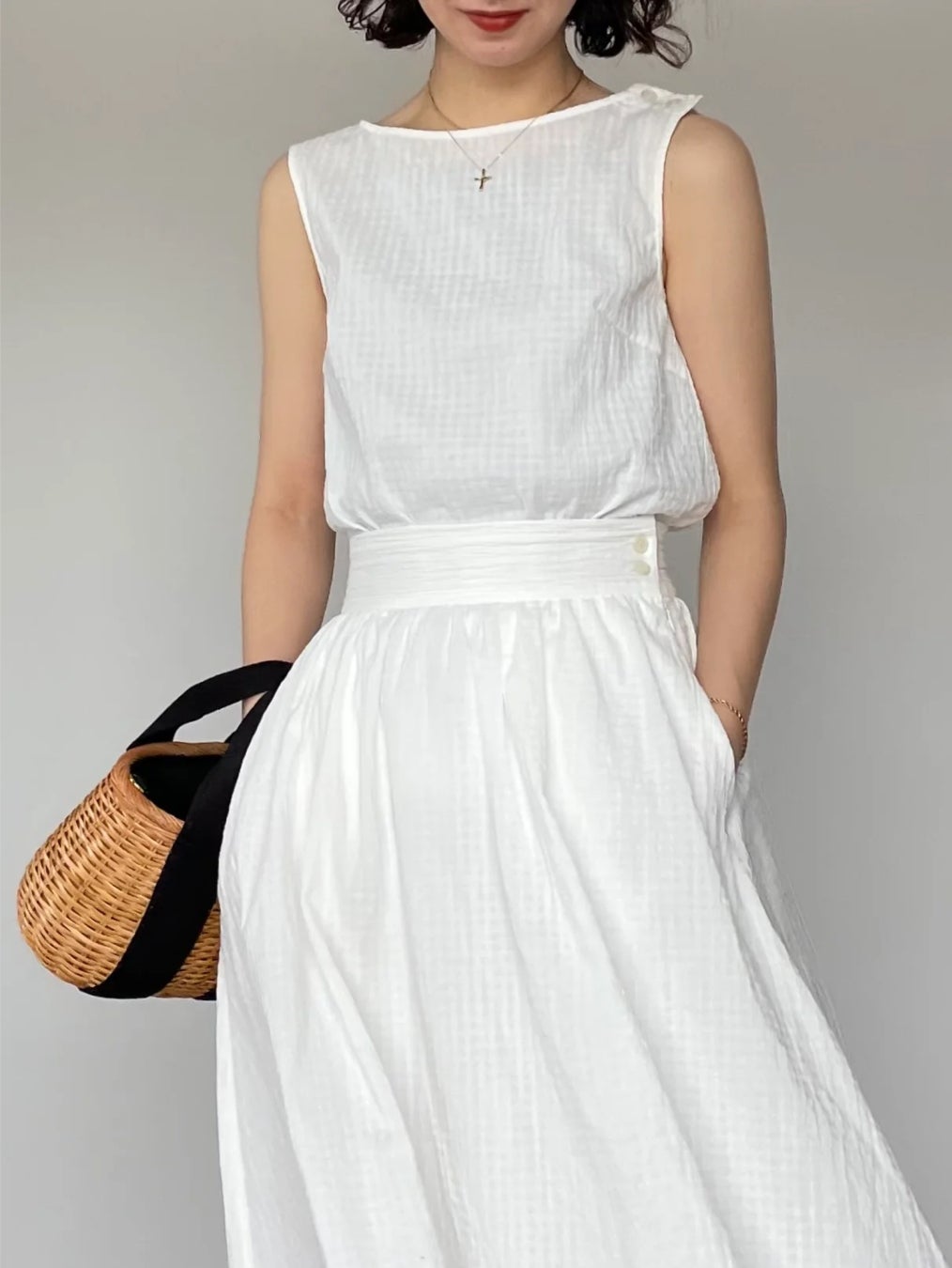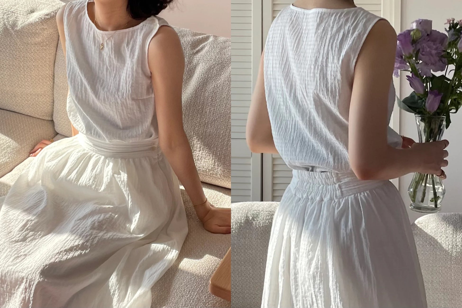 太めのウエストベルトは2本のピンタックがさりげなく上品に、