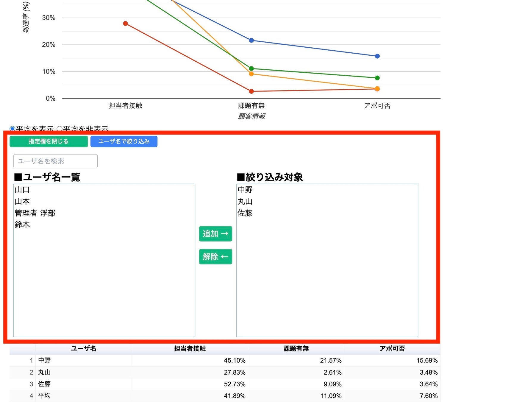 また「平均を表示」ボタンをおすと、対象メンバーの平均線がでるので、平均と比べて誰が、どのファネルで弱いのかなど簡単に確認できます。