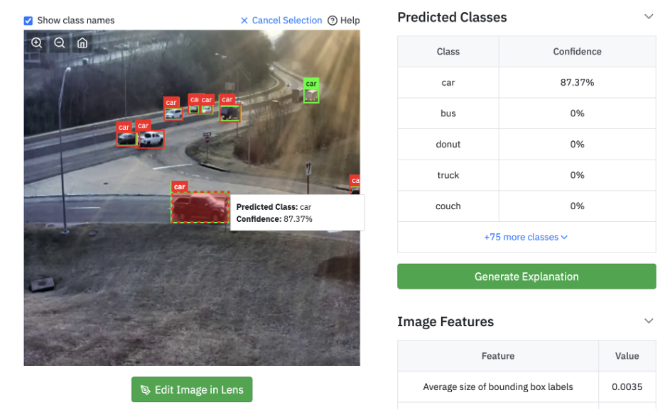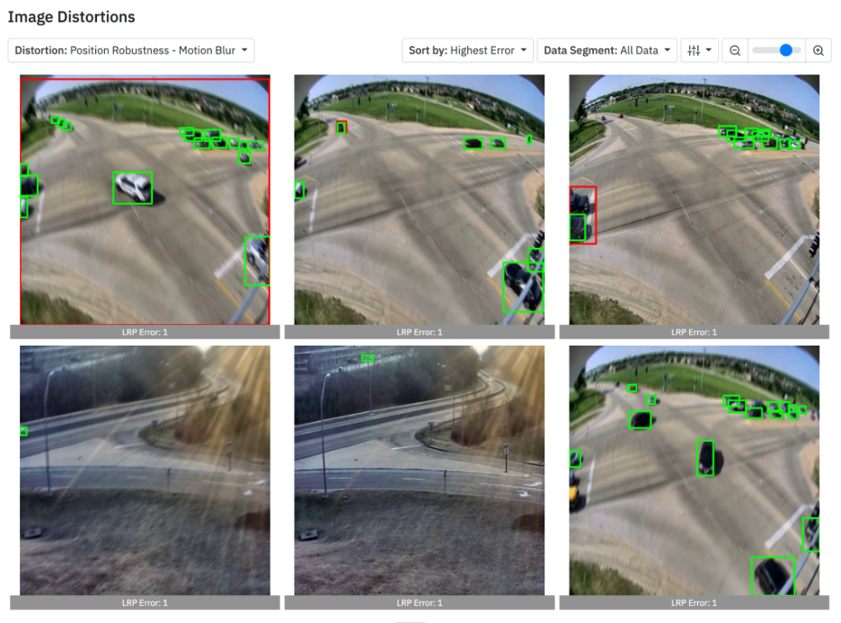 画像に付加されたメタデータや、画像固有の明るさ等の特徴量を組み合わせたデータスライスを実行し、精度の出ていないデータセグメントを自動で洗い出した上で、データセグメントごとのさまざまな精度指標を容易に確認することも可能です。