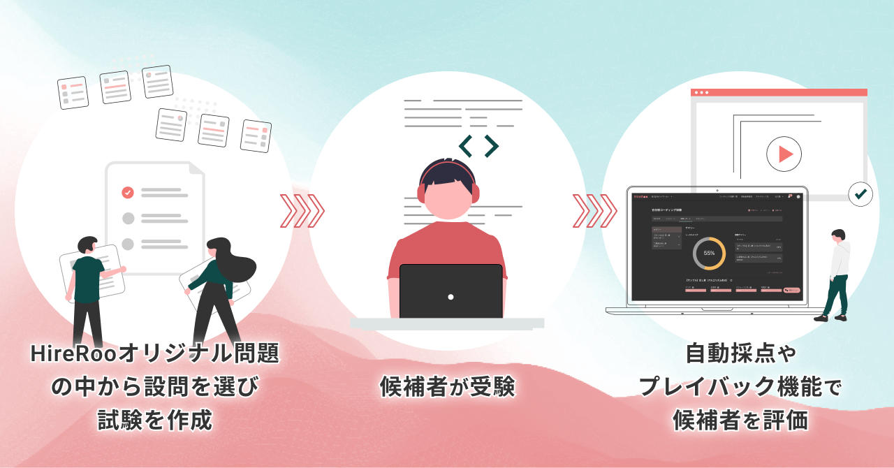 『HireRoo(ハイヤールー)』は、エンジニア採用時のコーディング試験サービスです。リモート下での技術評価に必要なツールをすべて兼ね備え、AIによる自動採点やスクリーニングなどでスキルを可視化し、採用ミスマッチを防ぎます。