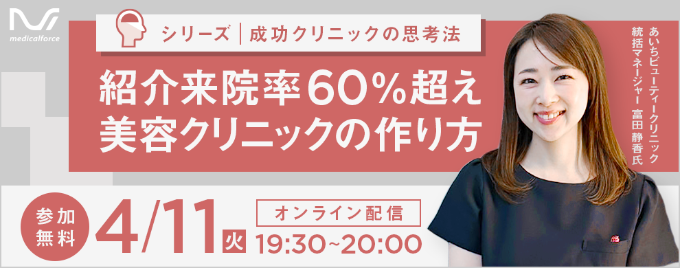 【無料ウェビナー開催のお知らせ】 4/11(火)19:30~ | 紹介来院率60%超え美容クリニックの作り方