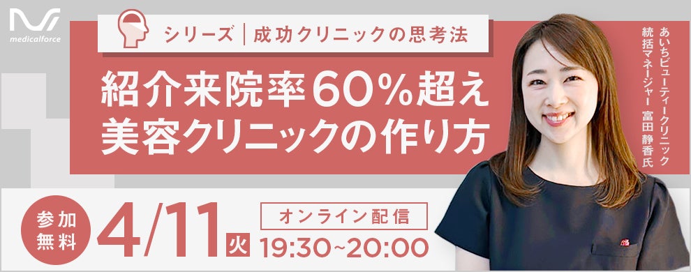 自由診療向けのオールインワンSaaS「medicalforce」を提供する株式会社メディカルフォース(所在地:東京都品川区、代表取締役社長:大嶋 翼)は、あいちビューティークリニックの富田静香氏をゲストにお迎えし、美容クリニック向けの特別ウェビナーを開催します。日時は2023年4月11日(火)19:30~20:30、参加費は無料です。
