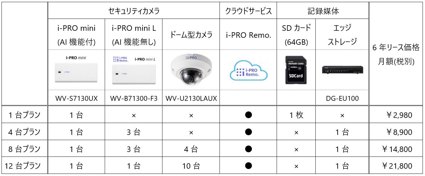 AIプロセッサー搭載セキュリティカメラなどの機材(※1)とクラウドサービス、設置工事や初期設定、オンサイト保守を含む「6年あんしん保証」(※2)をパッケージ化したリース商品です。飲食・小売等をはじめとする事業者様向けに、業務用セキュリティカメラの新しい導入方法として開発しました。初期費用がかからず、毎月定額の経費として処理できますので、中小規模の事業者の方々にもご活用いただき易くなりました。