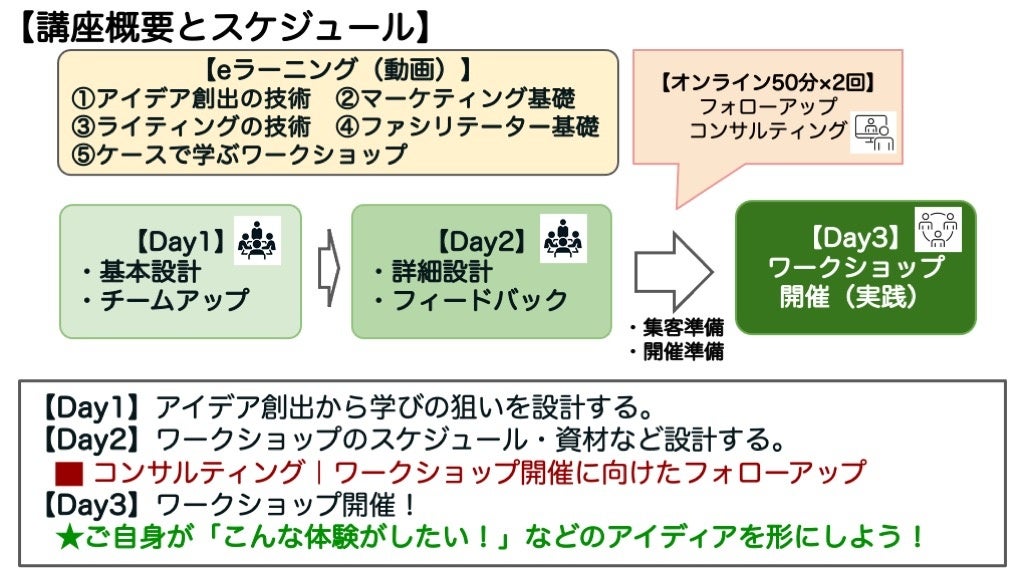 eラーニングでビジネス基礎を学び、2日間のワークショップ設計の後、実際にワークショップ開催。