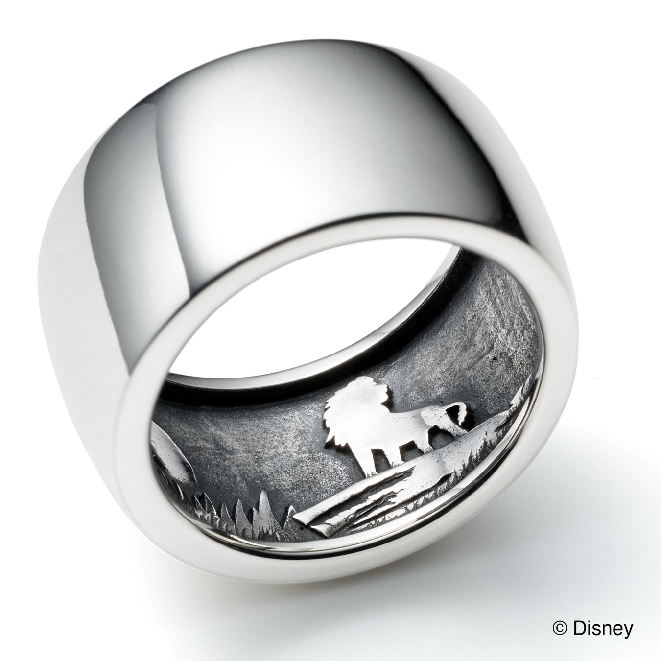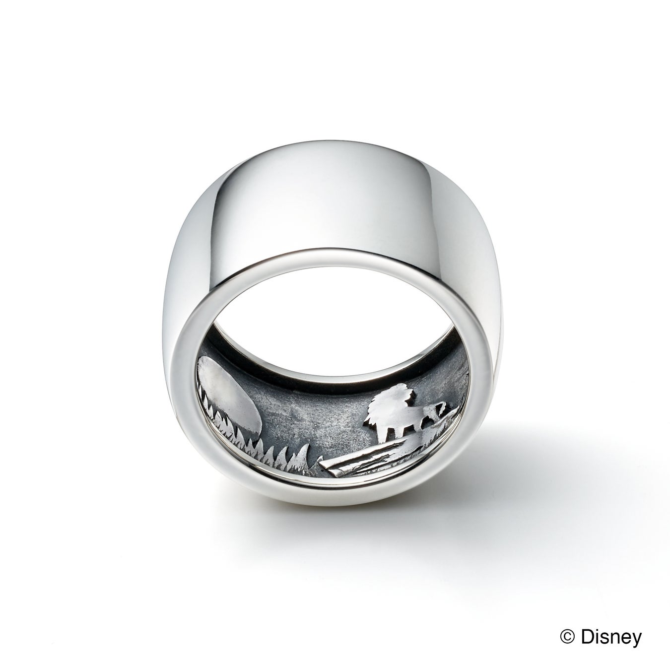 シンプルなボリュームリングの内側に夕焼けにただずむムファサとサバンナの情景を繊細に表現したアイテムは、緻密な彫刻に燻しを施すことでディテールを強調しムファサの毛並み、木の幹、岩肌の質感などが美しく表現されています。