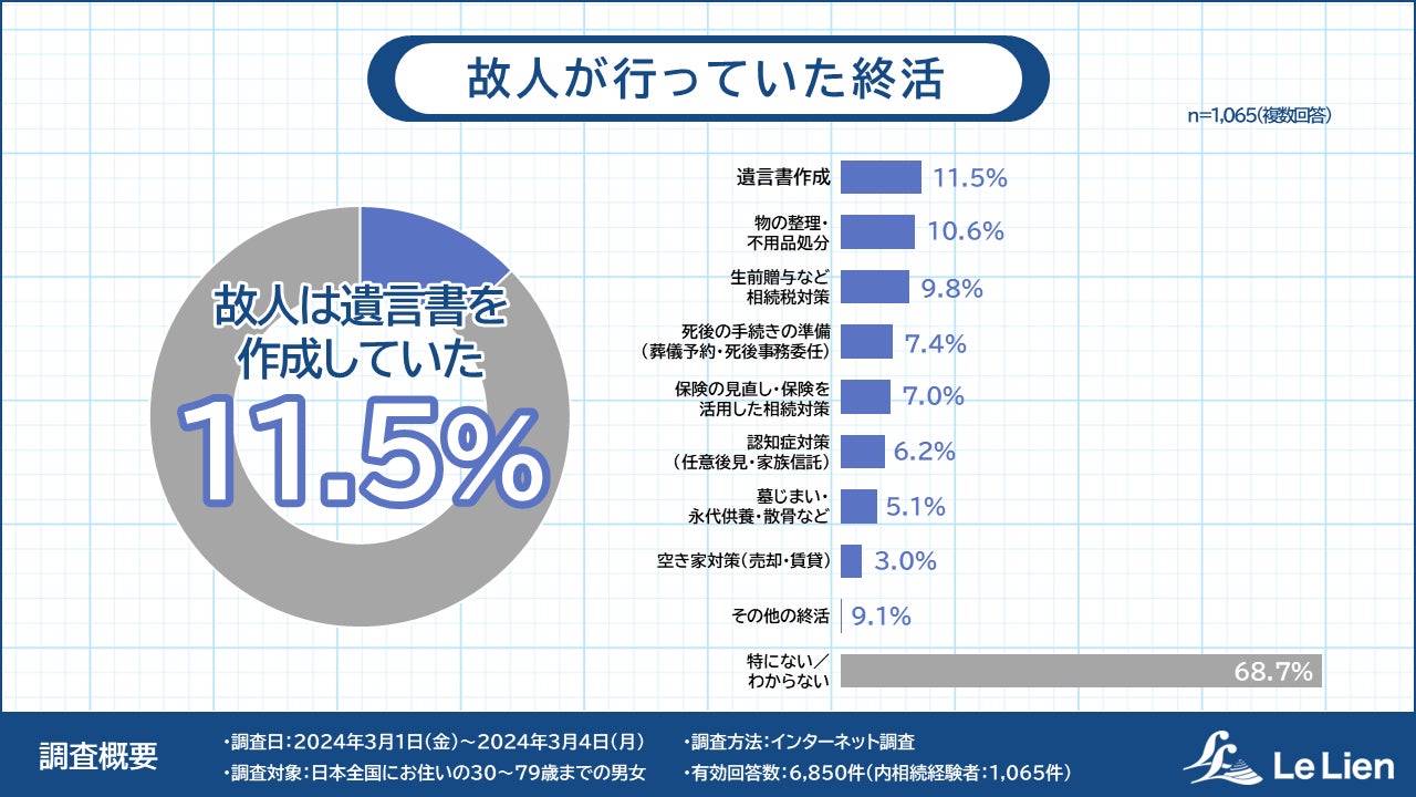 故人が生前に行っていた終活に関して聞いたところ、指定の選択肢の中で最も回答が多かったのは「遺言書作成」で11.5%でした。「物の整理・不用品処分」(10.6%)、「生前贈与など相続税対策」(9.8%)と続きました。