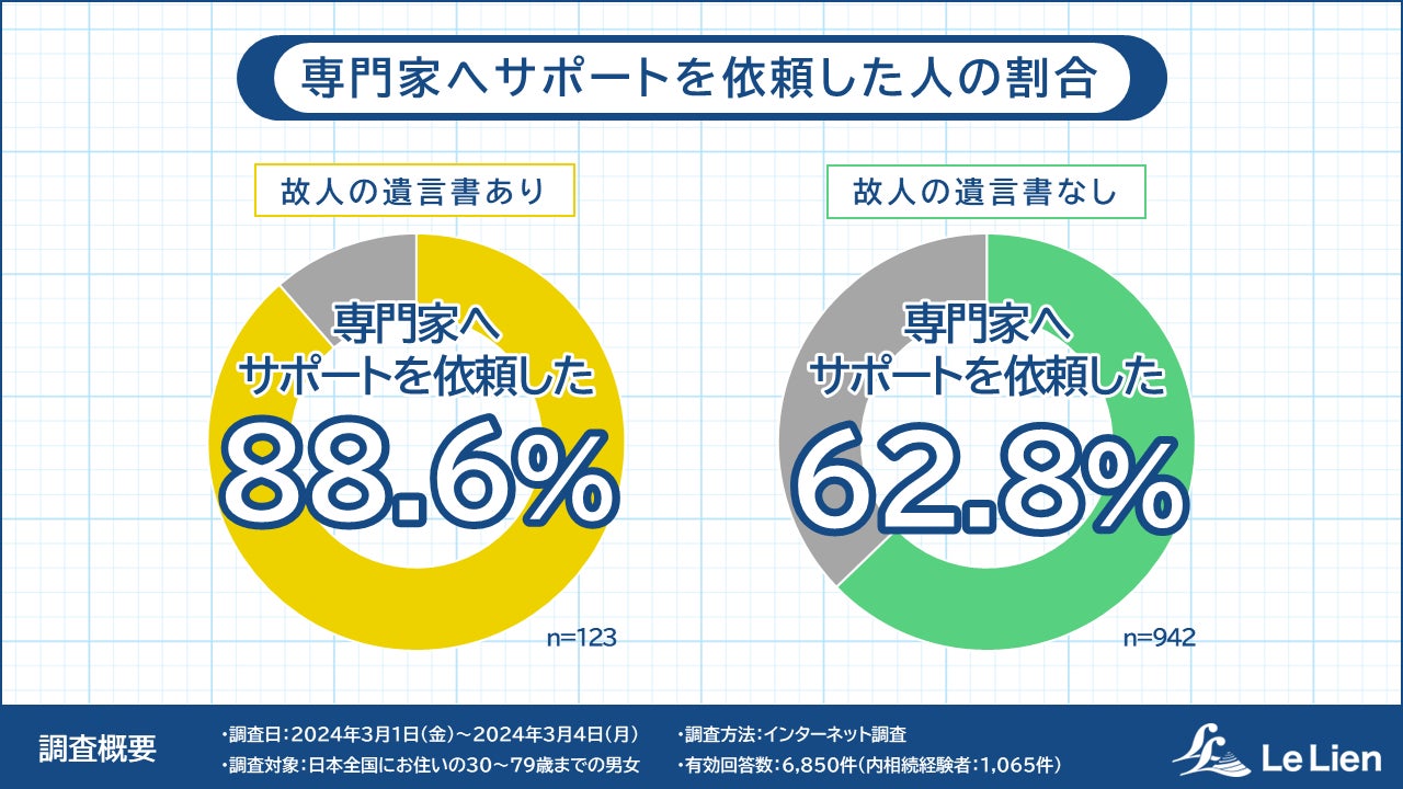 遺言書の有無により、専門家に相続手続きのサポートを依頼する割合に違いがあったかどうかについては、遺言書を作成していた場合は88.6%で、作成をしていなかった場合は62.8%という結果でした。