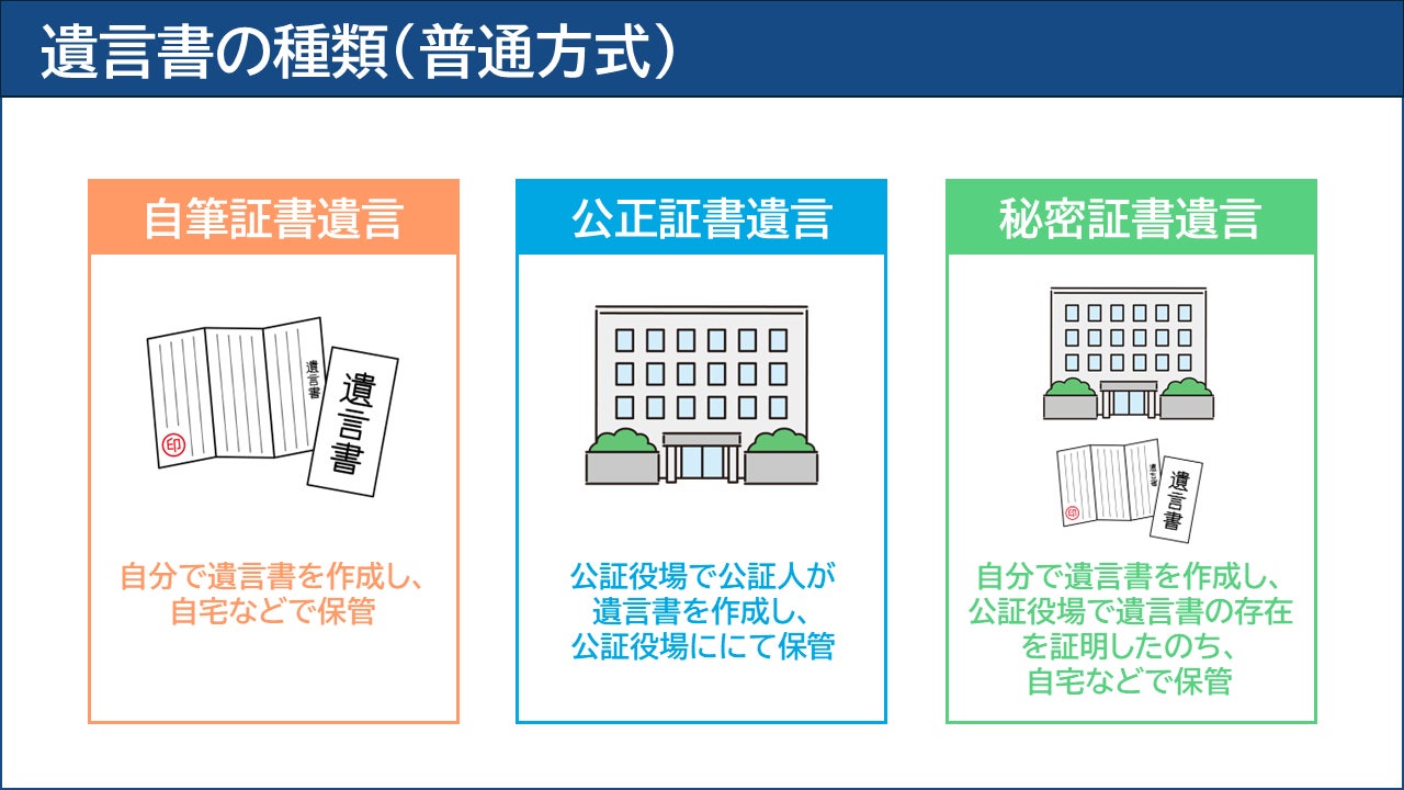 故人の遺言書についても、自分の遺言書についても留意しなければいけないことがあります。まず故人の遺言書では特に「検認方法」が大事です。故人が作成した自筆証書遺言および秘密証書遺言を発見した場合は、速やかに家庭裁判所に検認を請求する必要があります。ただし、自筆証書遺言が法務局に保管されている場合、検認は不要です。検認前に自分たちで開封してしまうと法律違反となり、過料を科される可能性もあります。そして自分の遺言書では特に「作成方法」が大事です。一言で遺言書と言っても、普通方式の遺言書には①自筆証書遺言 ②公正証書遺言 ③秘密証書遺言の3種類存在します。