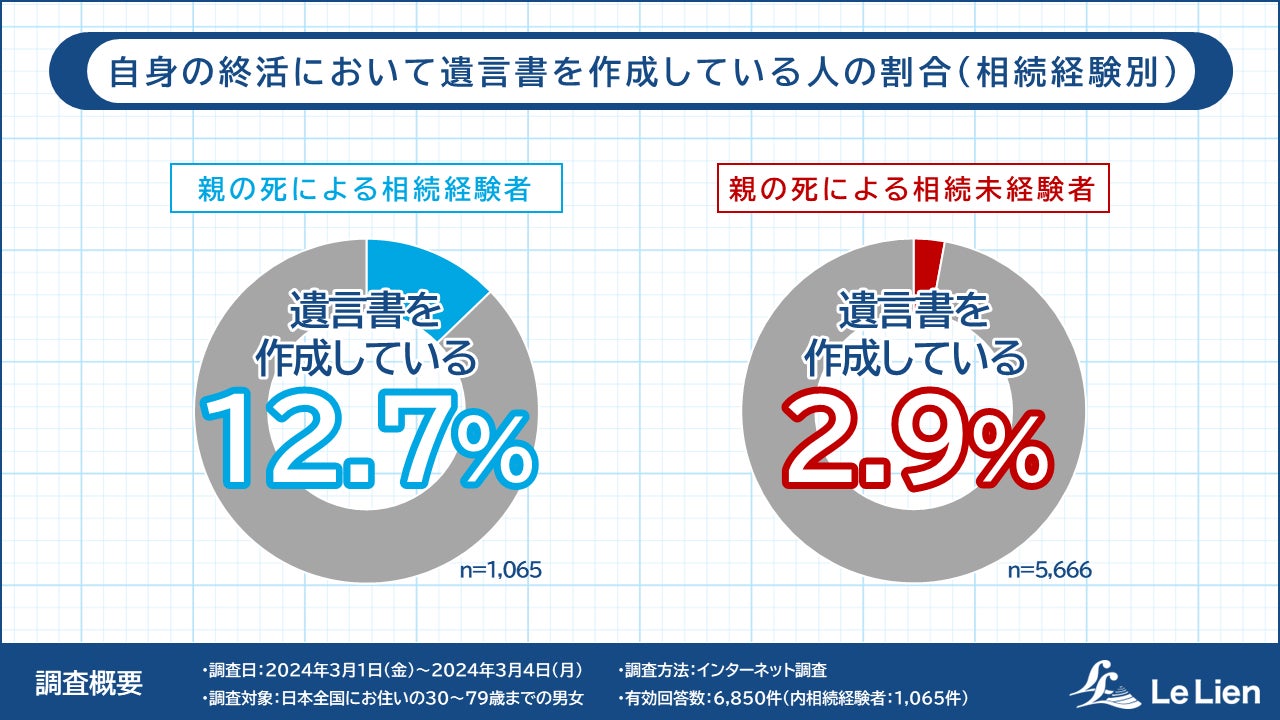 親の死による相続の経験の有無と、自身の終活において遺言書を作成している割合について比較したところ、親の死による相続の経験者のうち12.7%、未経験者のうち2.9%となりました。相続経験者は未経験者と比較し、4倍以上の割合で遺言書を作成していることがわかりました。
