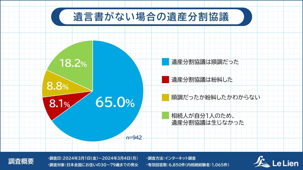 遺言書が作成されていなかったと回答した人が、遺産分割協議の進捗をどのように感じたかについては、全体の3分の2に当たる65.0%が「遺産分割協議は順調だった」という回答でした。一方で、8.1%が「紛糾した」という答えでした。