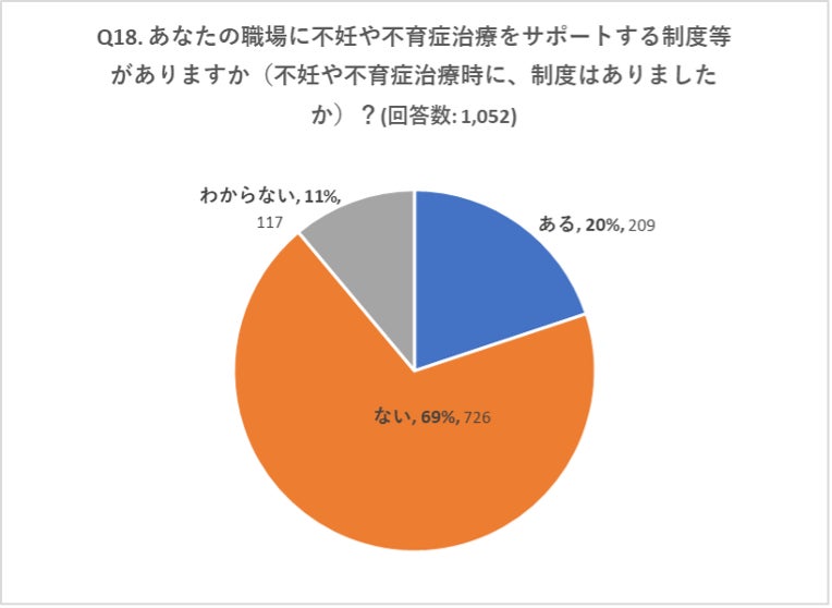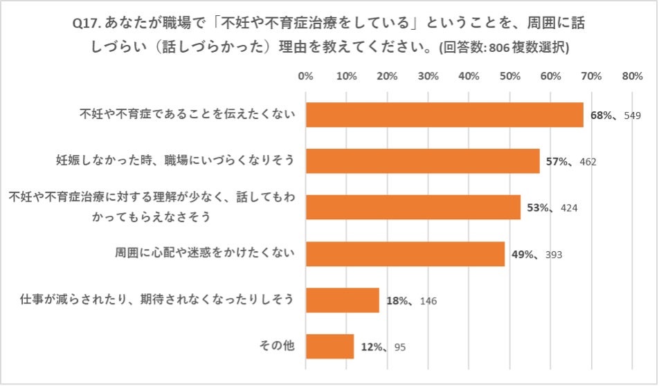 その理由で最も多いのは、「不妊や不育症であることを伝えたくない」(68%)。「妊娠しなかった時、職場にいづらくなりそう」(57%)、「不妊や不育症治療に対する理解が少なく、話してもわかってもらえなさそう」(53%)と続く(Q17)。(図11~図13参照)
