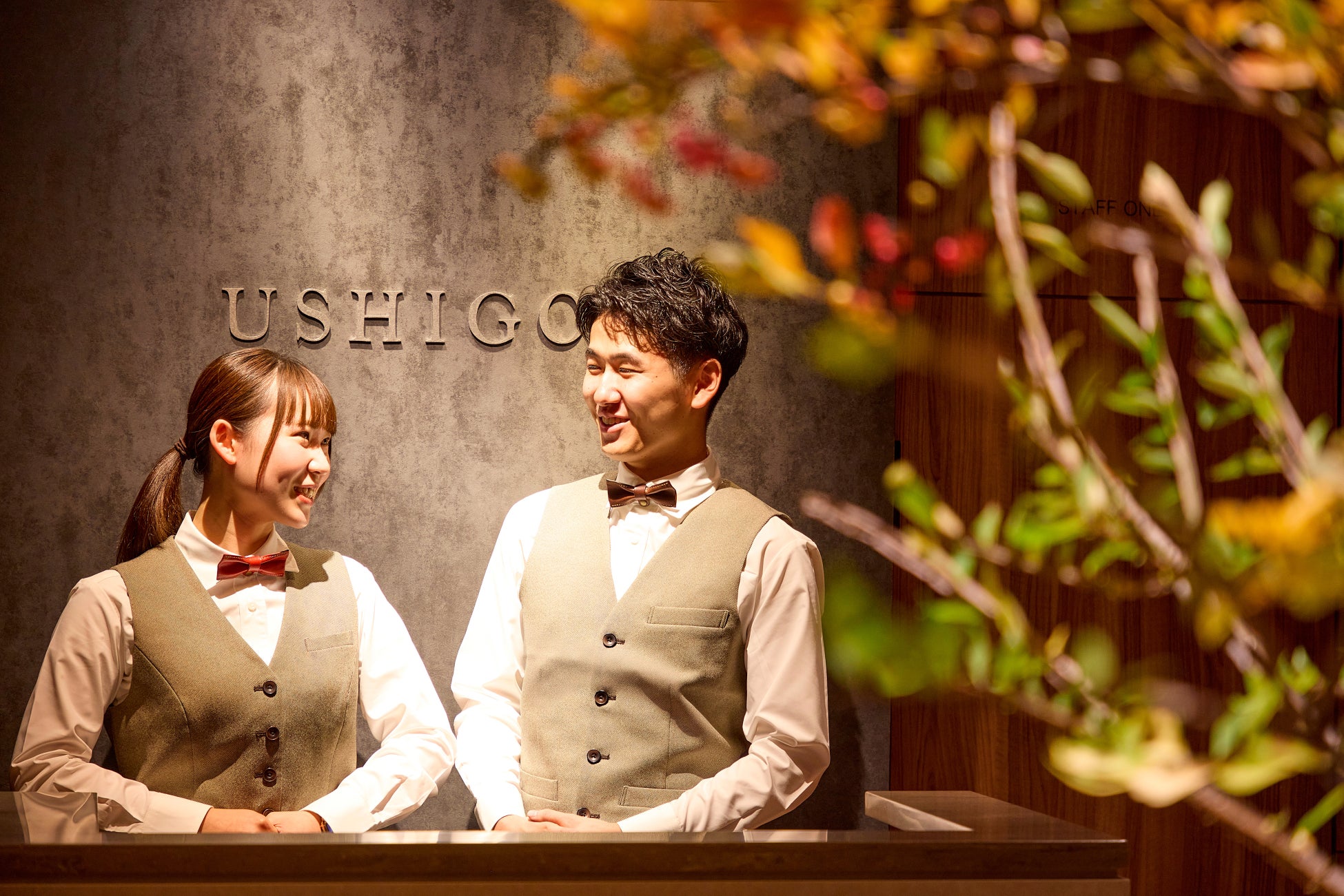 特注のレザー蝶ネクタイをはじめ、ベストとデニムパンツを組み合わせた新しいスタイルは、フォーマルになりすぎず、都会的な焼肉ブランドである「焼肉うしごろ」にぴったりのデザインです。