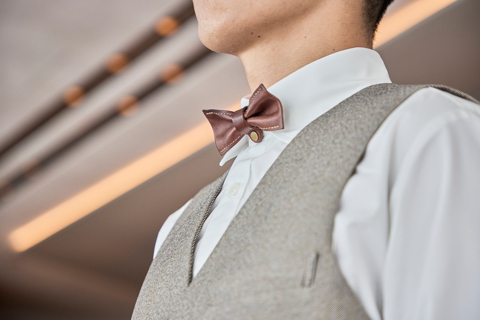 レザー蝶ネクタイは、扱いが難しく高価な素材ではありますが、上品で存在感があり、いまでは“うしごろ”を象徴するアイテムのひとつになっています。