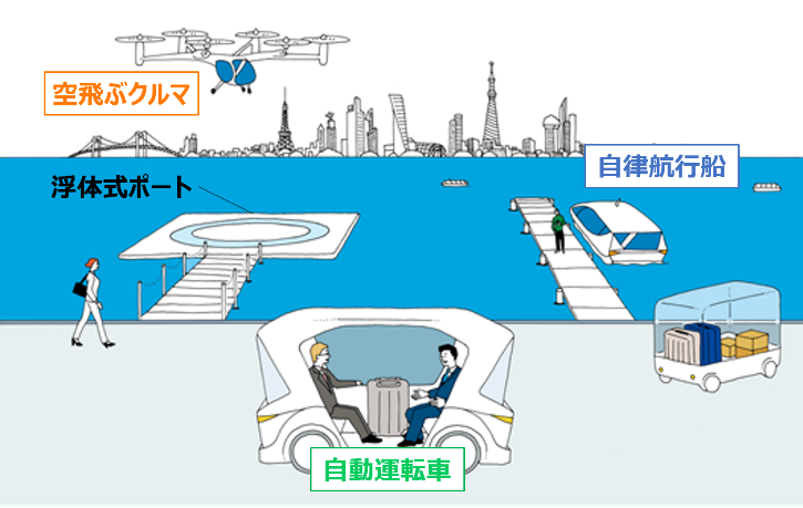 さらに、人々の行動様式や価値観の多様化が進む中、空飛ぶクルマの離発着場からの自動運転車や自律航行船による二次交通も含めた検討を行うことで、シームレスな移動を可能にする新たなライフスタイルの実現を目指します。