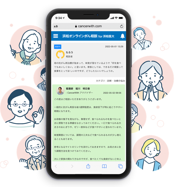 オンラインで24時間、匿名でも相談可能なので、いつでも不安に感じたときに気軽に相談することができます。浜松市からの後援を受け、浜松医大の患者さんとそのご家族だけでなく、浜松にゆかりのあるがん患者さんとそのご家族にも無料でご利用いただけます。
