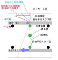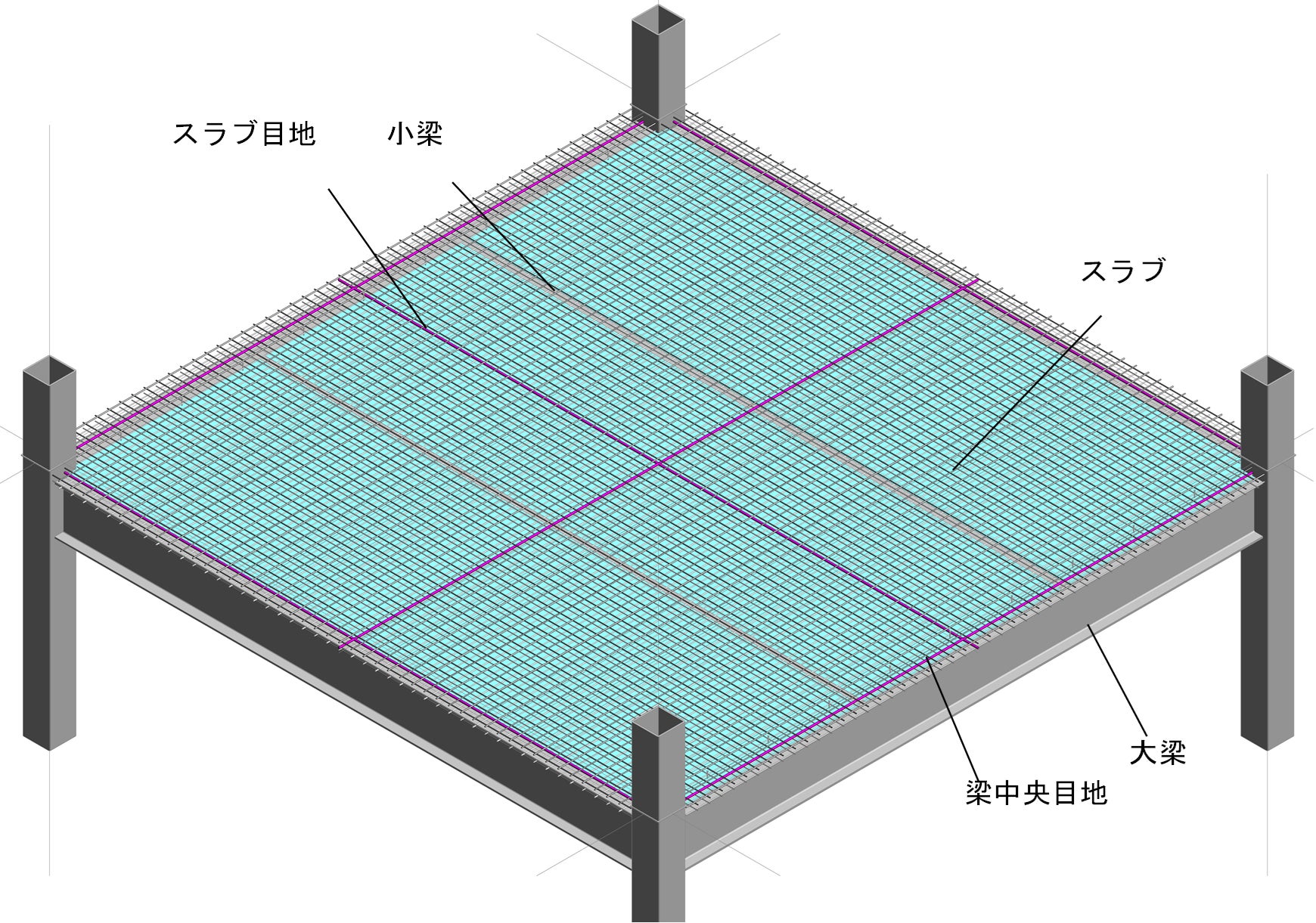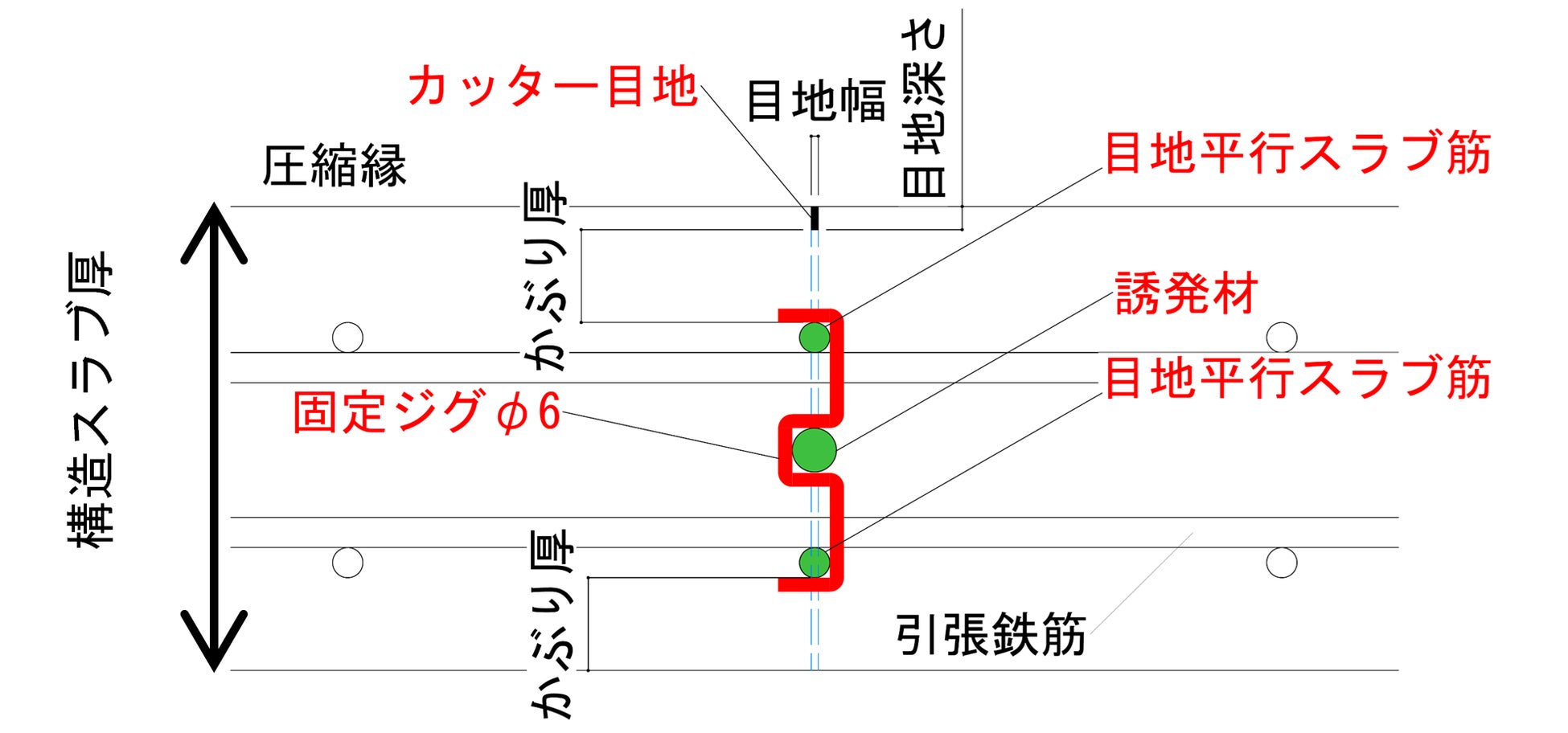 大梁上中央部(RC梁の場合は梁幅両側)およびスパン内に、カッター目地、誘発材と目地平行スラブ筋を一直線上に配置する。